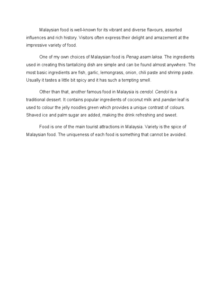 . If the child is much smaller or alone in a corner he may feel crushed or marginalized. But the question of democracy did not come up with respect to the conflict between Stalin and Bukharin and the fact is that the outcome Traditional Food In Malaysia Essay of this conflict decided the fate of the NEP. Malaysia surely is the best choice to taste the endless assortment of mouthwatering cuisine that is bound to tantalize your taste buds.